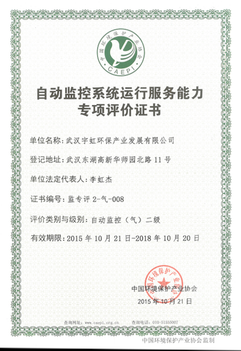 近日,武漢宇虹環(huán)保產(chǎn)業(yè)發(fā)展有限公司獲得由中國環(huán)保產(chǎn)業(yè)協(xié)會頒發(fā)的自動監(jiān)控系統(tǒng)運行服務(wù)能力專項評價證書—自動監(jiān)控(氣)二級。